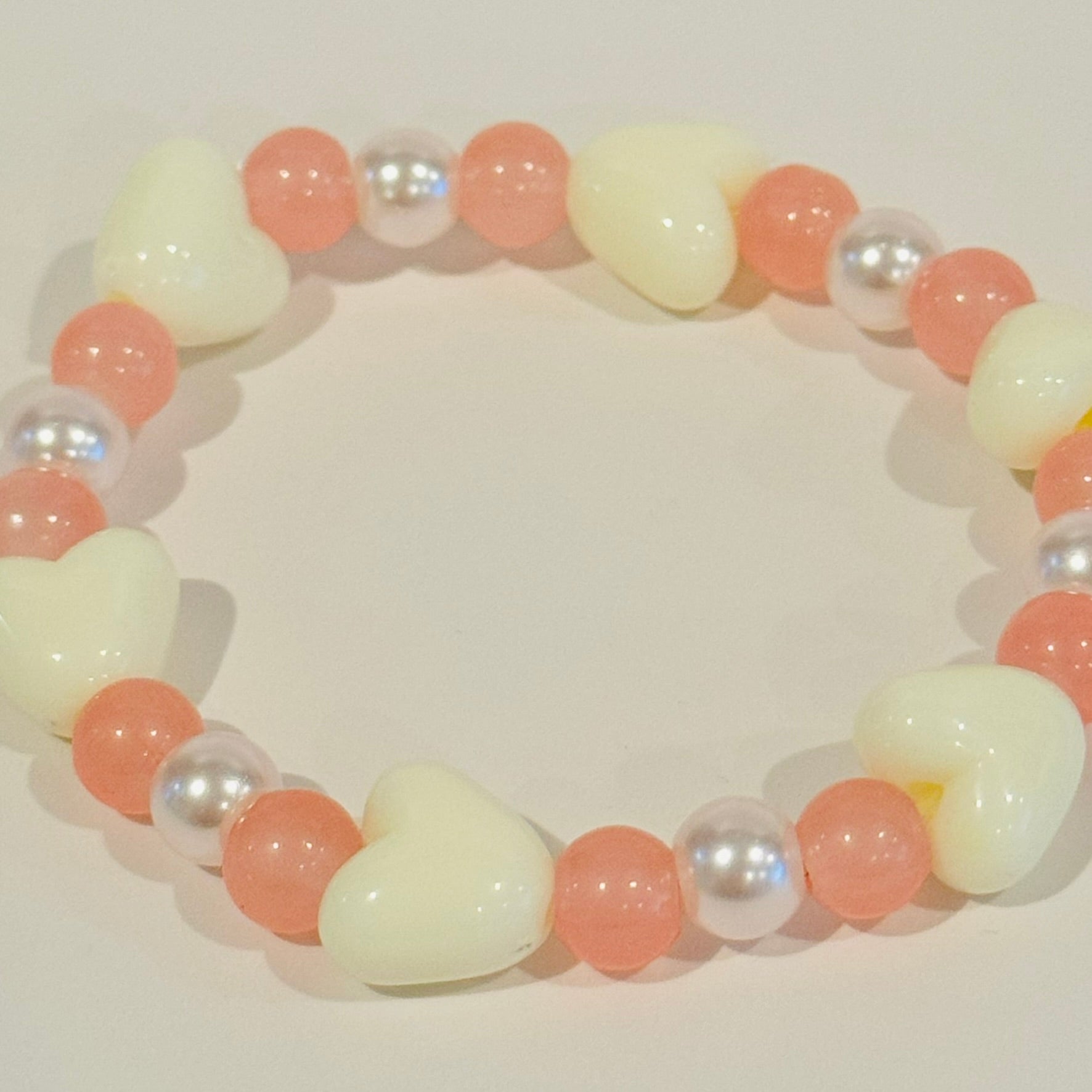 SEW pretty and matching a variety of outfits, these youth-sized bracelets have a 6" circumference and are made with a stretchy elastic band and using 6 mm glass crystal beads, alternating between a blush pink color and glossy white, with off-white plastic 3D hearts throughout.
