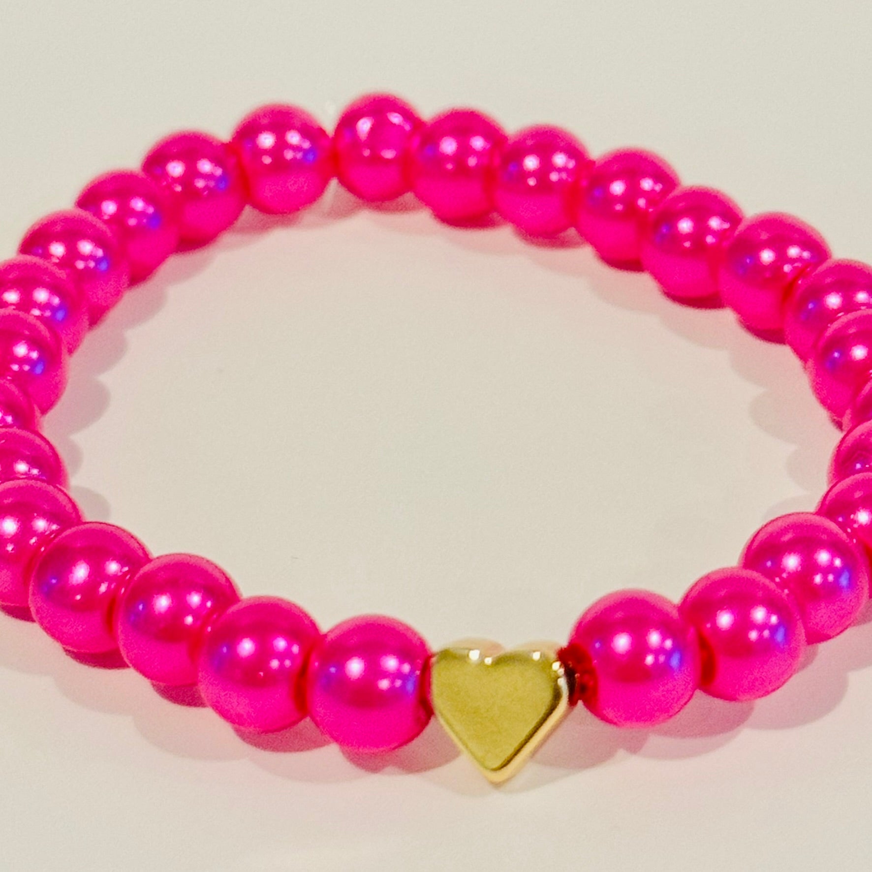 SEW pretty and matching a variety of outfits, these youth-sized bracelets have a 6" circumference and are made with a stretchy elastic band and using 6 mm glass crystal beads in a glossy hot pink color, and complete with a beautiful metallic gold heart at the center point.